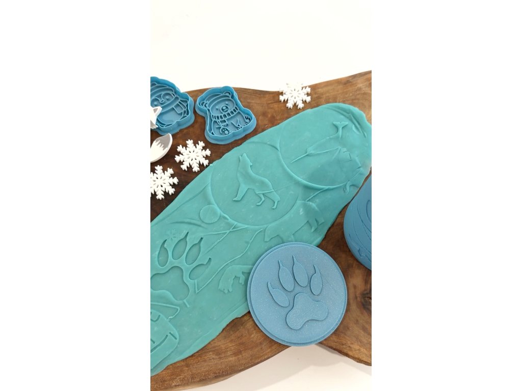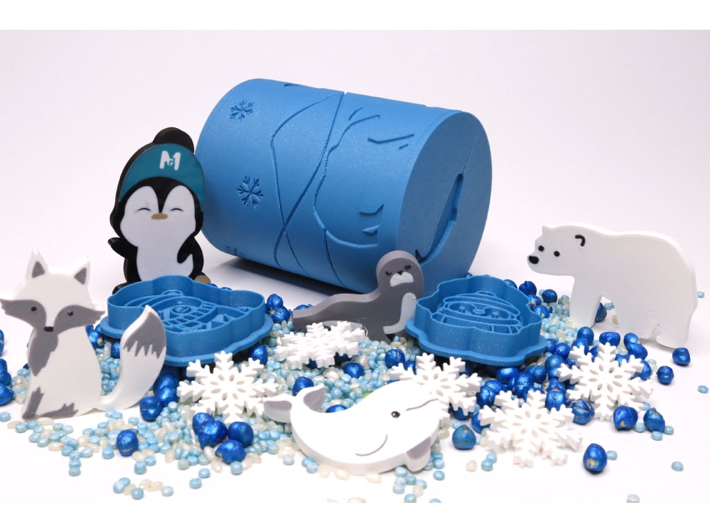 Hlavní hvězdou setu je krásný 3D váleček, který při každém přejetí plastelínou odhaluje roztomilé zimní motivy, jako je iglú, lední bílý medvěd či polární liška, hory a sníh. Kromě toho má váleček ze spodní části další zvířátko (narvala) na otiskování do plastelíny a také víčko obsahuje až dva otisky - stopu a vlka.