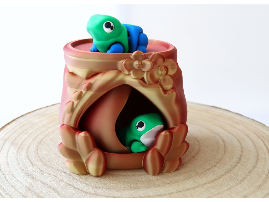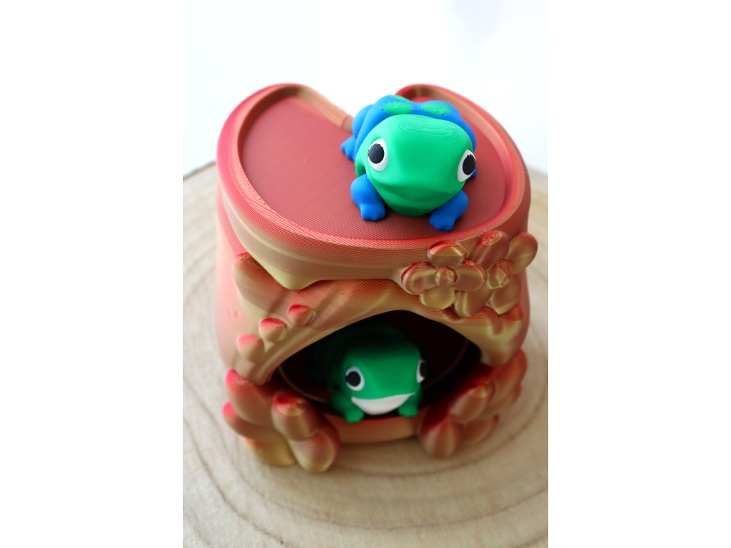 Domeček má otáčecí dveře. Žabka se tak může schovat dovnitř.