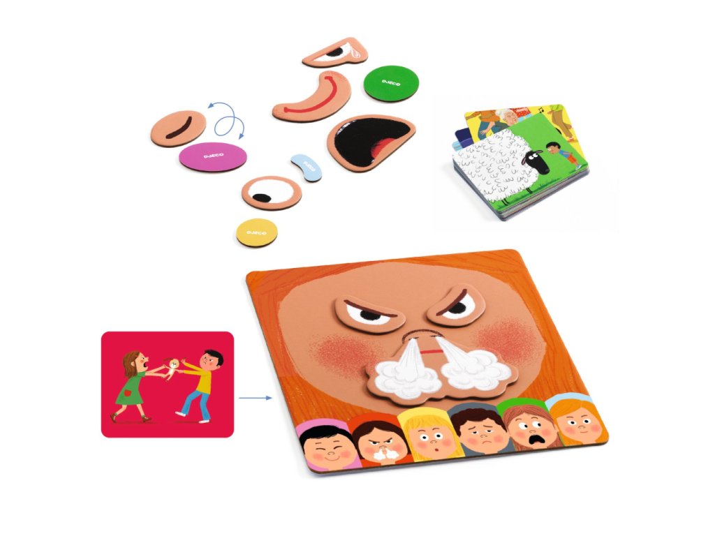Cílem této jazykové hry je podpořit vnímání emocí přes hravou činnost. Probíhá za účasti dospělého. Dítě popisuje ilustrované scénky na kartičkách, rozeznává 6 zobrazených emocí (radost, hněv, překvapení, smutek, strach a klid) a modeluje je ukládáním dílků – částí tváře – na magnetickou podložku.