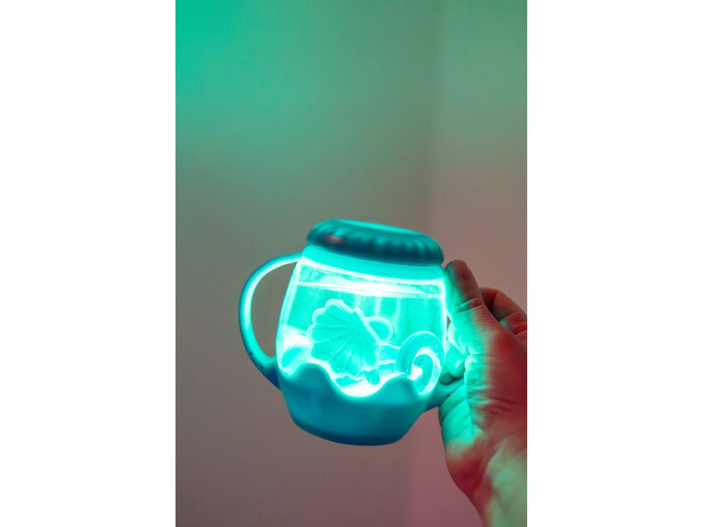 Plnění vodou: Naplňte nádobu vodou, aby se aktivovalo osvětlení. Klepnutím na základnu nádoby změníte barvu světla. Po 5 sekundách začne nádoba automaticky cyklicky měnit barvy.