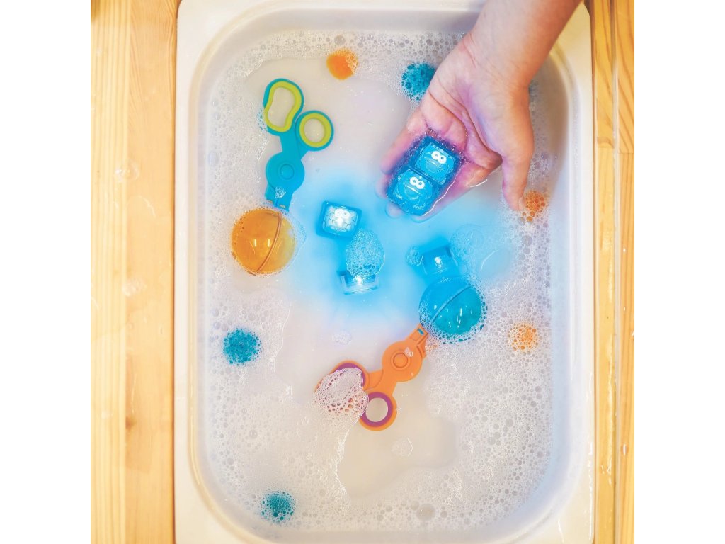 Čištění snímačů: Pokud si všimnete, že kostky po několika koupáních svítí méně jasně, vyčistěte kovové kontaktní body (senzory aktivující světlo).