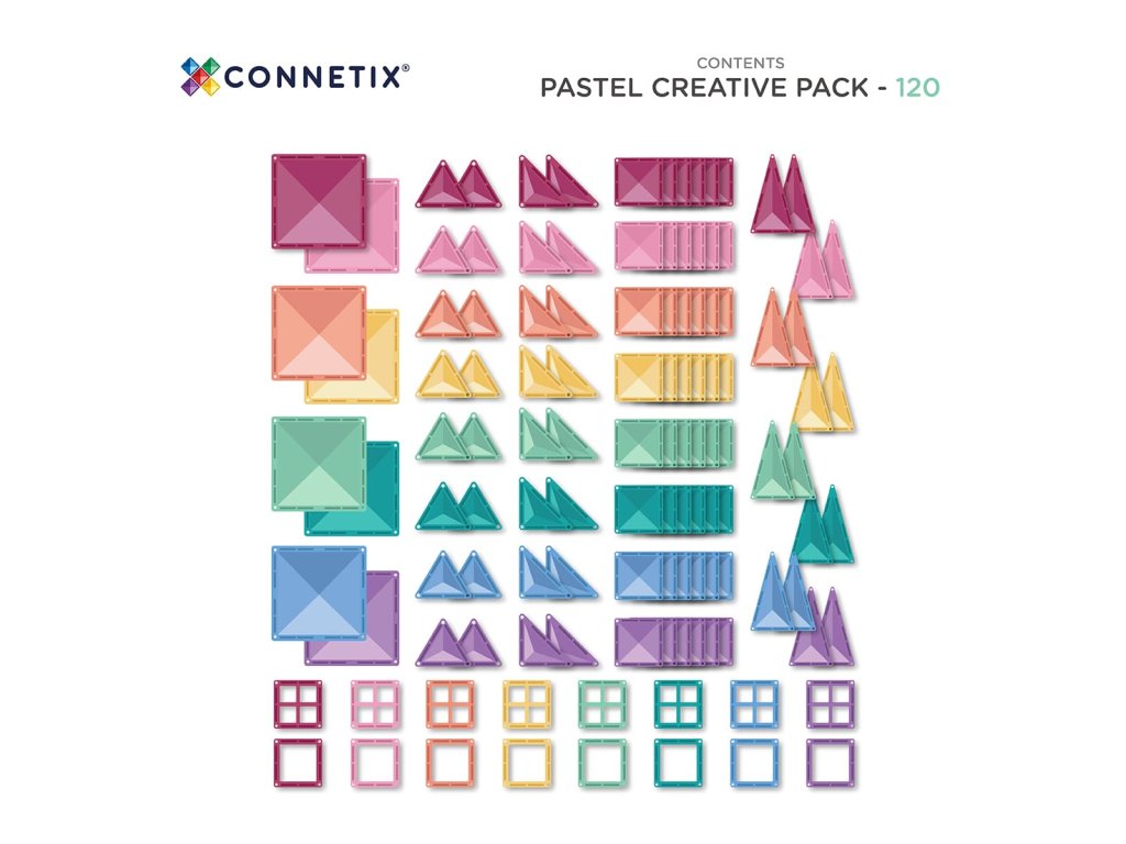 Naše pastelová kreativní sada je navržena tak, aby podporovala hodiny neomezené kreativity, zábavy a učení prostřednictvím HER a obsahuje různé tvary v 8 pastelových barvách. Je to skvělá startovací volba pro rodinnou hru, stavění VELKÝCH výtvorů CONNETIX a rozšiřování škály barev, které vaše děti rozeznají.