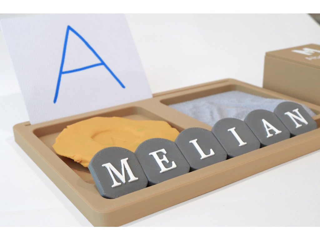 Vidím (Prostor na kartičky) V horní části tácu se nachází drážka na vložení kartiček s písmeny, čísly nebo obrázky. Děti mohou pozorovat, napodobovat a učit se prostřednictvím vizuální asociace.