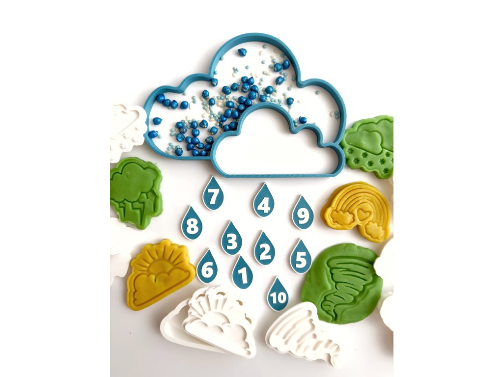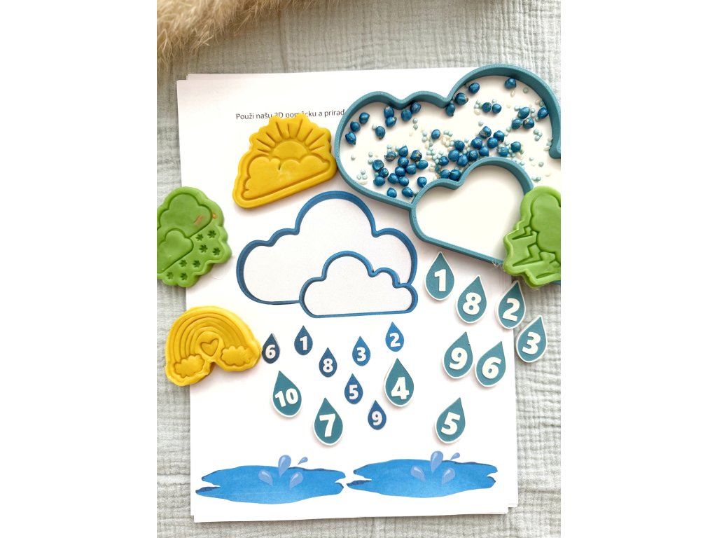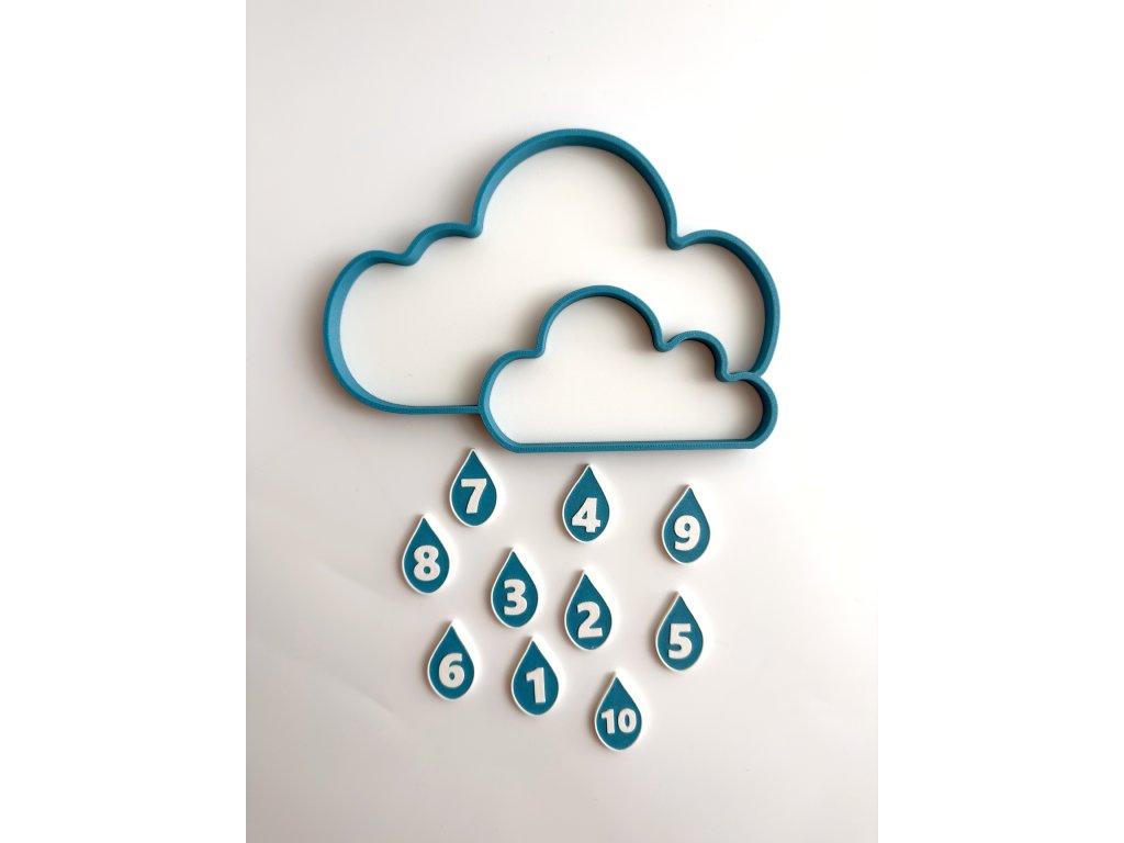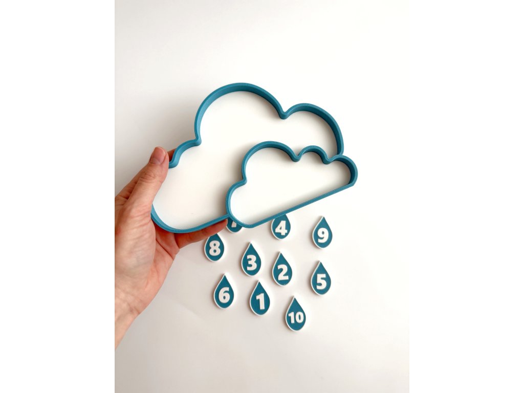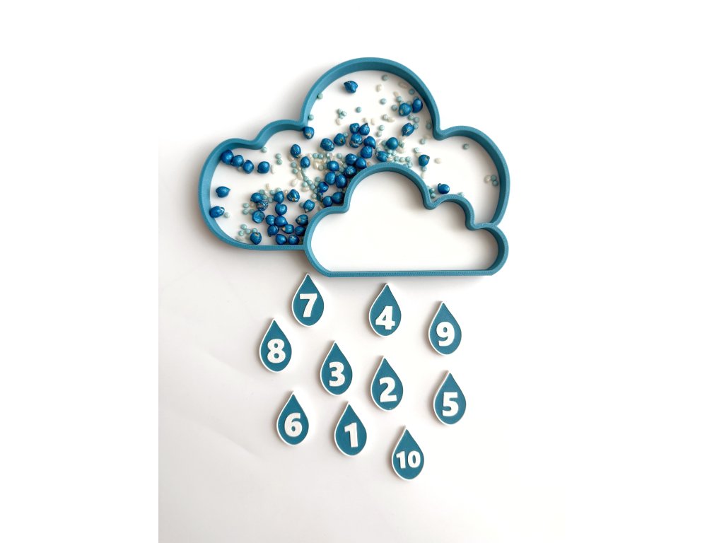 Oblak s dešťovými kapkami je 3D tištěná senzorická pomůcka navržená pro klidné smysluplné učení přes hru. Zároveň slouží i jako vysypávací podnos na sypký materiál, jako je rýže, cizrna či jiné drobné materiály.