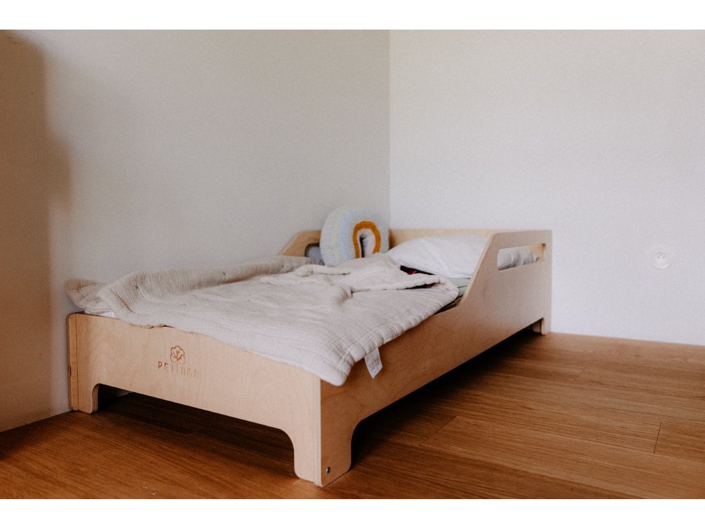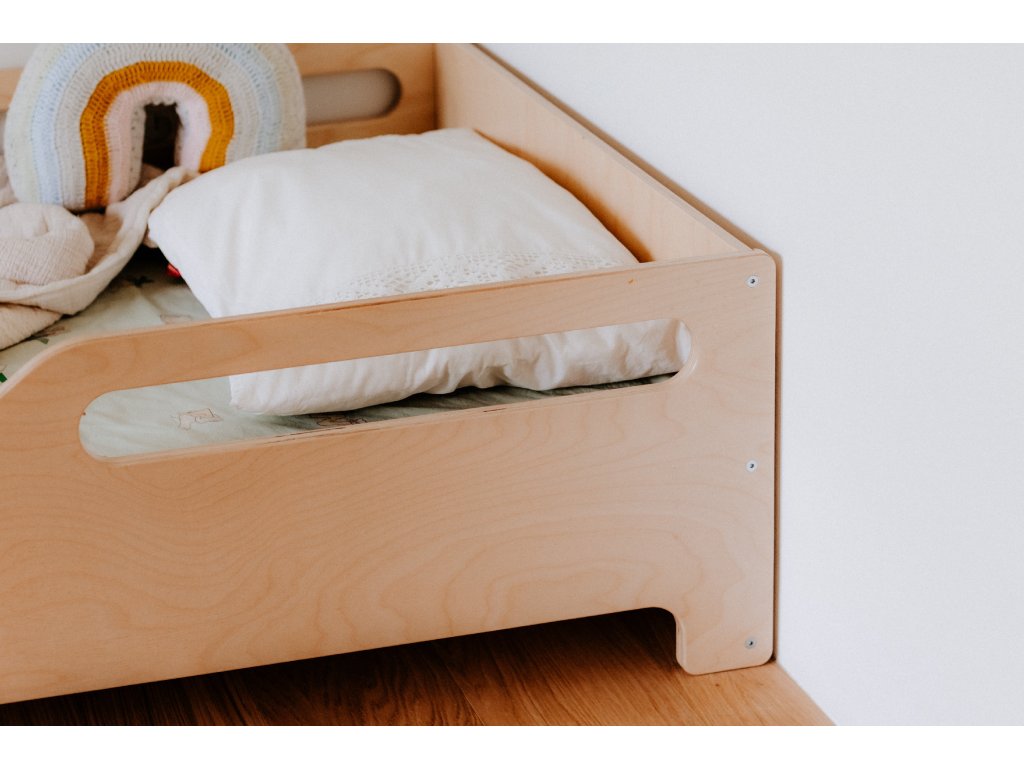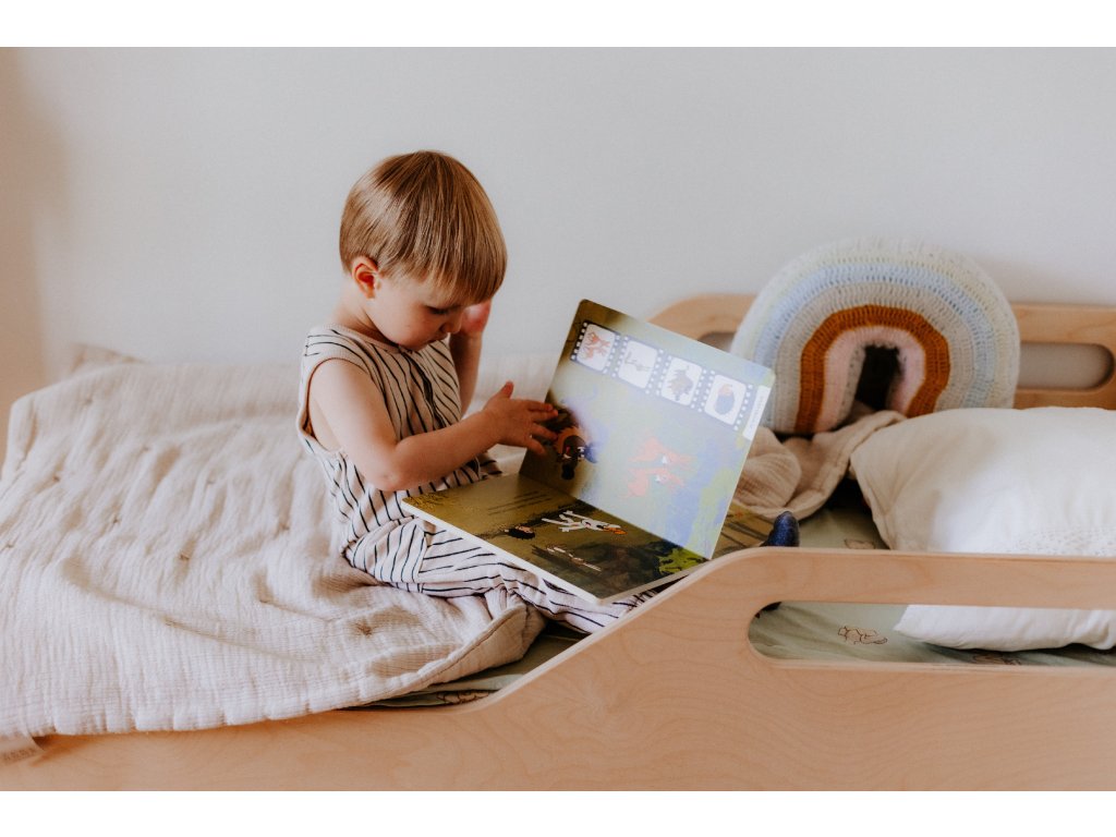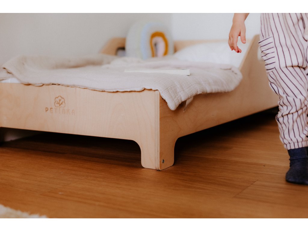 Montessori dětská postýlka Hugo je navržena podle principů Marie Montessori, které podporují samostatnost, přirozený pohyb a zdravý vývoj dítěte. Díky nízké konstrukci dokáže dítě pohodlně samo vylézat i slézat, čímž se posiluje jeho sebevědomí a motorika. Postýlka je zároveň vysoce bezpečná – vyvýšené boční okraje sahají do poloviny postele a účinně zabraňují pádu během spánku. Její nadčasový design v přírodním provedení krásně zapadne do každého dětského pokoje a harmonicky ladí s moderním i Montessori interiérem.