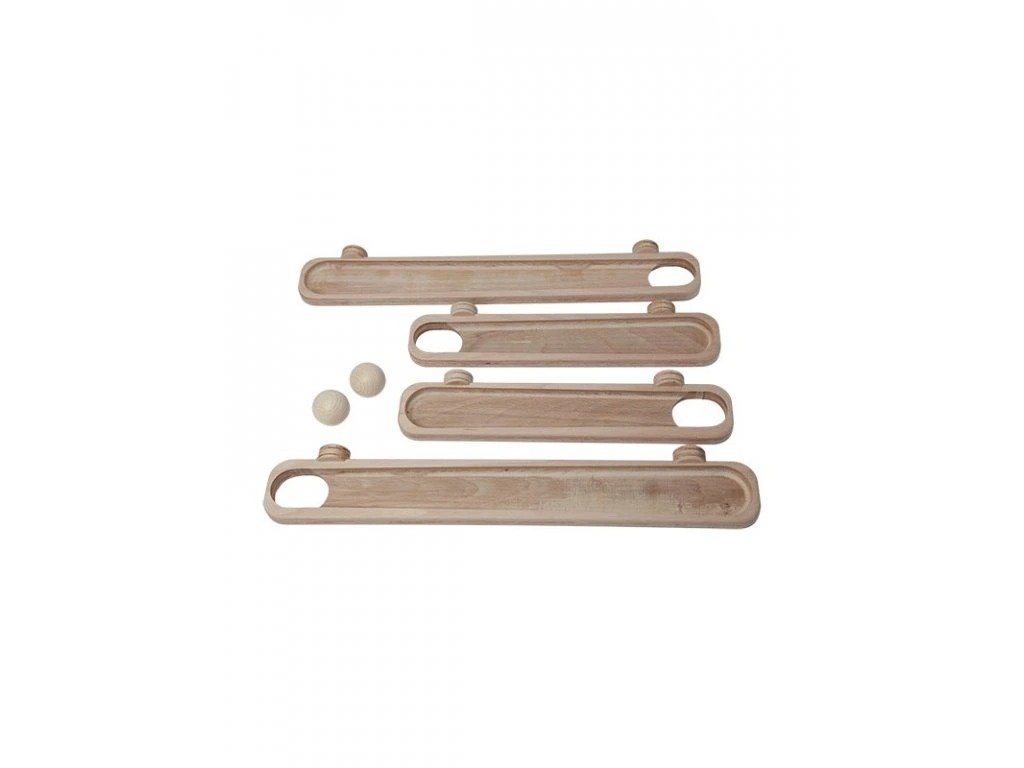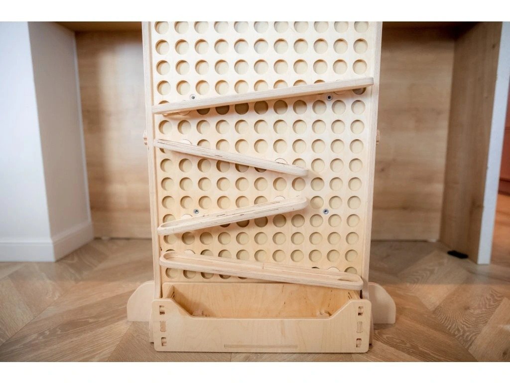 Děti mohou sledovat jejich dráhu, předvídat pohyb a objevovat princip příčiny a následku, čímž si přirozeně rozvíjejí logické myšlení, soustředění a jemnou motoriku. Celá konstrukce je plně kompatibilní s hrací stěnou Ready-to-Activity, takže ji jednoduše zakomponujete do existujícího Montessori herního prostoru. Tato Montessori kuličková dráha je ideální volbou pro rodiče, kteří hledají edukační dřevěné hračky, activity board doplňky a kreativní pomůcky pro děti, které podporují přirozený rozvoj a zvědavost.