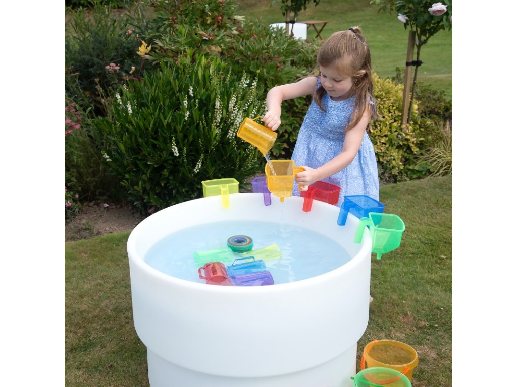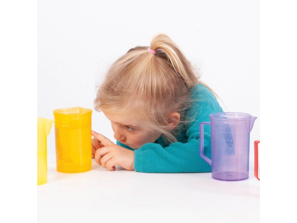 Barevné džbánky jsou vyrobeny z odolného průhledného plastu, díky čemuž jsou lehké, bezpečné a zároveň vhodné pro každodenní používání při dětské hře. Tyto univerzální pomůcky jsou vhodné nejen pro domácí prostředí, ale i pro mateřské školy či Montessori herny, kde děti mohou kreativně zkoumat vodu, písek, zrna nebo jiné materiály.