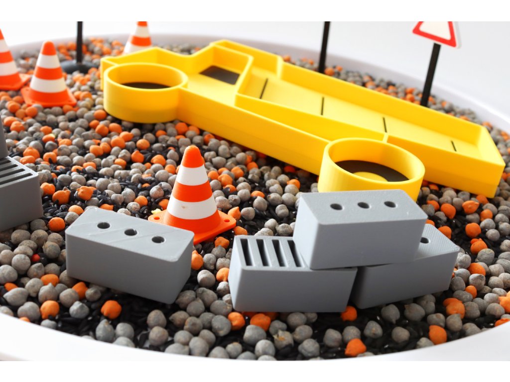 Děti mohou přesýpat, nakládat, vozit a manipulovat s různorodými materiály, jako praví dělníci na staveništi. Podnos ve tvaru stavebního vozidla - nakladače vytváří lákavý prostor pro hru, která podporuje smyslové vnímání, koncentraci a koordinaci oko-ruka.