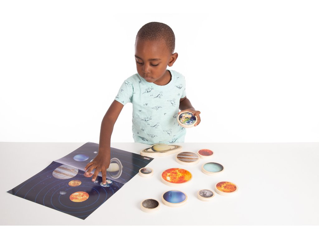Robustní disky se dětem snadno uchopují, otáčejí, převracejí a staví se do vzpřímené polohy. Na discích je i otvor na zavěšení, který umožňuje zavěsit disky jako mobilní sluneční soustavu.Tato všestranná sada poskytuje skvělou příležitost dozvědět se více o naší úžasné sluneční soustavě. Obrázky ukazují jasné detaily a funkce - ideální na diskuzi a zlepšení znalostí o vesmíru.
