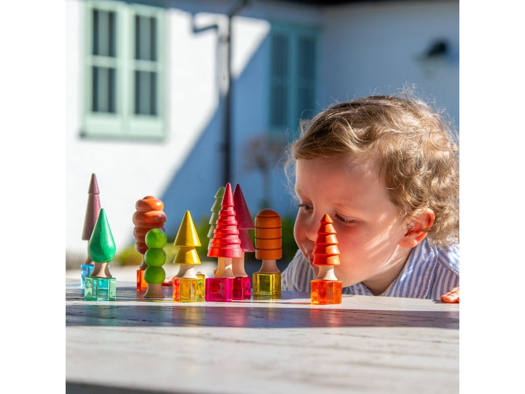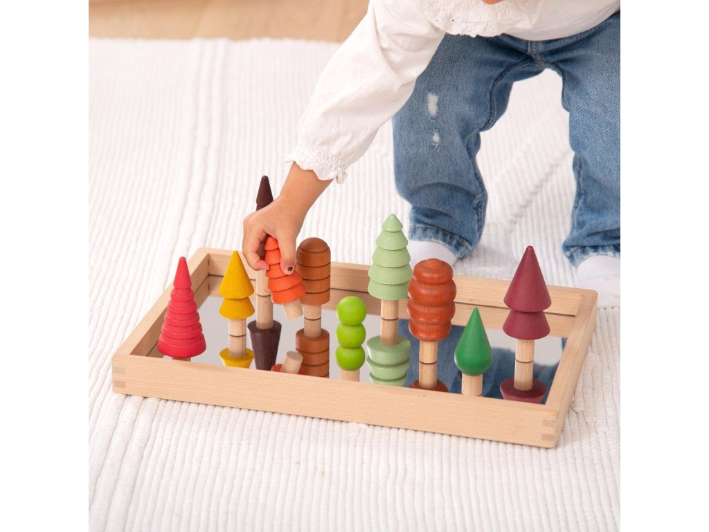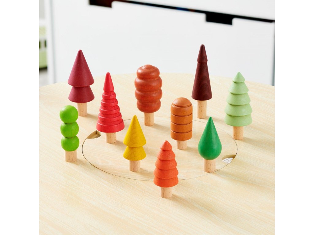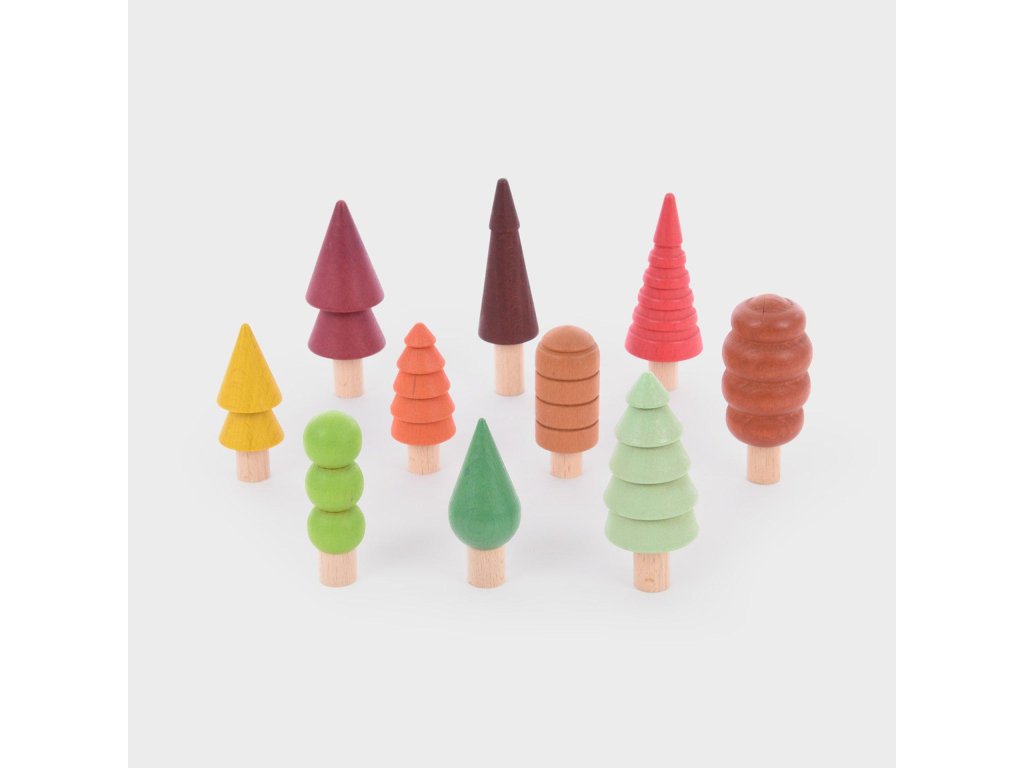 Sada obsahuje 10 různě tvarovaných stromečků v různých velikostech a přírodních odstínech hnědé, zelené, červené, oranžové a žluté.