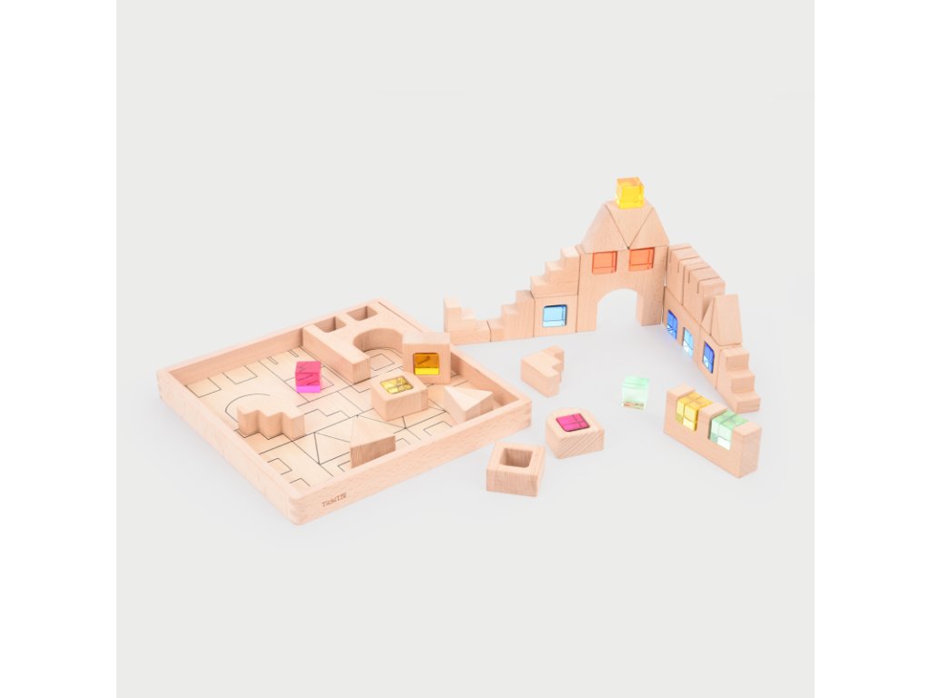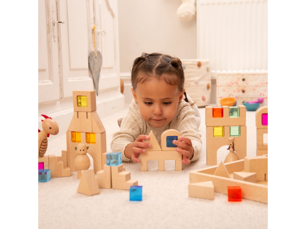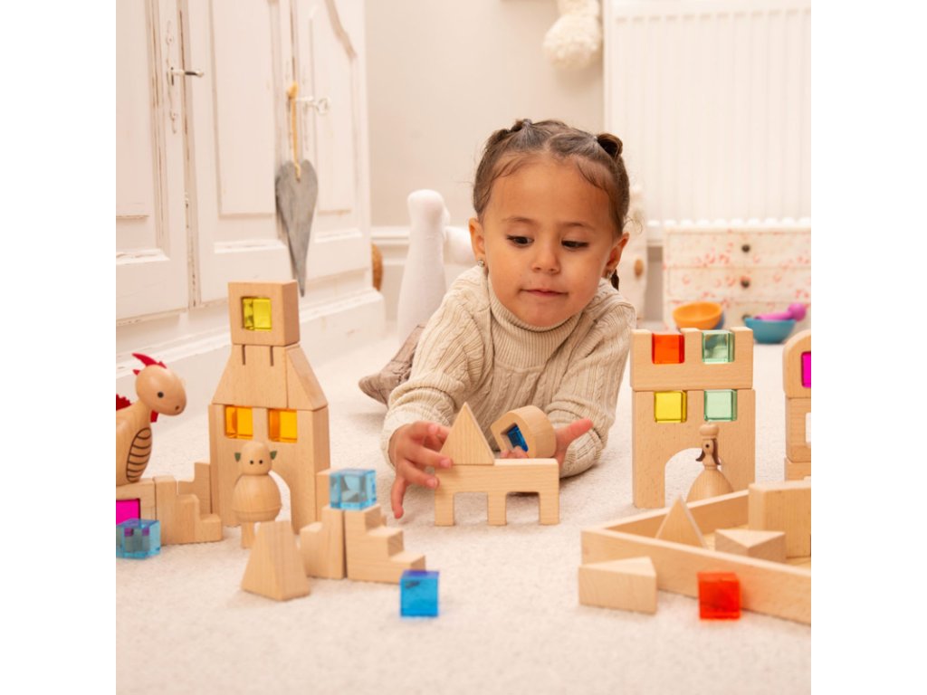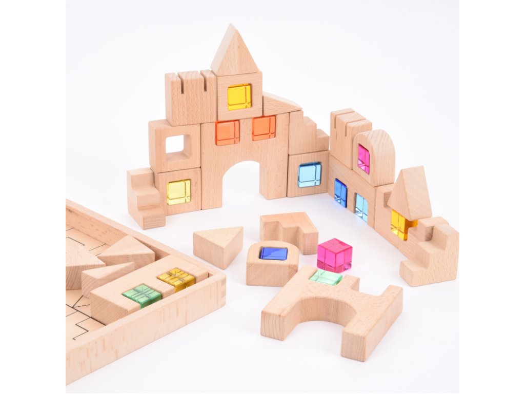 Kostky jsou pečlivě navrženy tak, aby byly různorodé, aby podporovaly kreativní stavění u starších dětí nebo jako jednoduchá aktivita na stohování a vyvažování u mladších dětí.