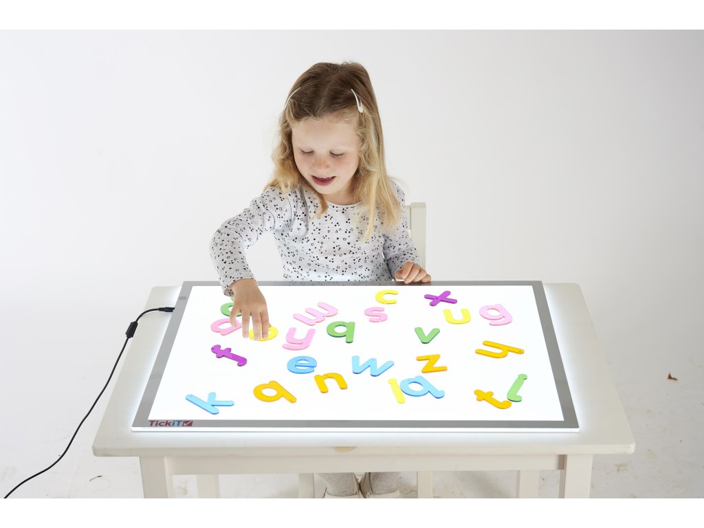 Děti se mohou učit tvary a názvy jednotlivých písmen. Použitím světelného panelu nebo TickiT® světelného stolu na