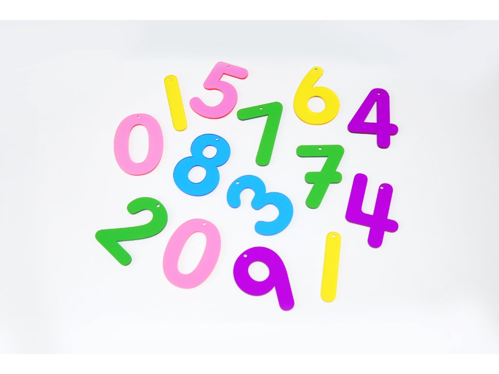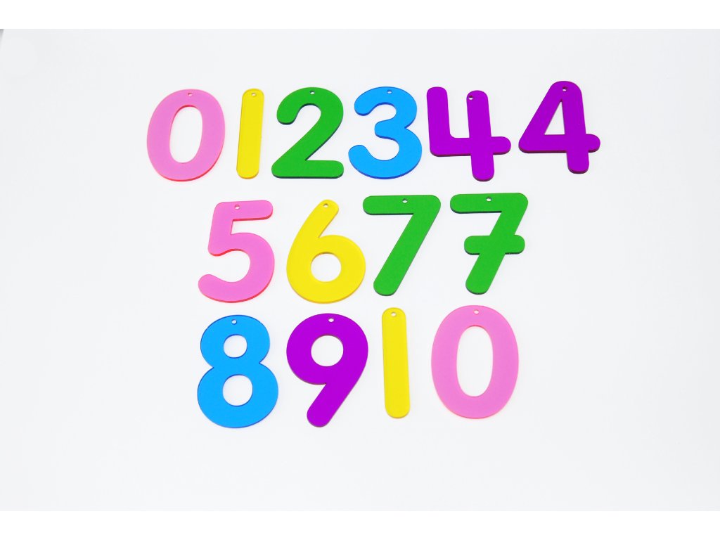 Čísla jsou vybavena 2,5mm otvorem v horním bodě rovnováhy, takže se dají zavěsit nebo připevnit na nástěnku. Barvy jsou růžová, žlutá, zelená, tyrkysová a fialová.