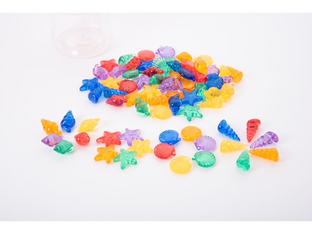 - 4 různé tvary (hvězdice, spirála, mušle a lastura) v 6 barvách (červená, oranžová, žlutá, zelená, modrá a fialová) v praktické nádobě na skladování s víčkem.
