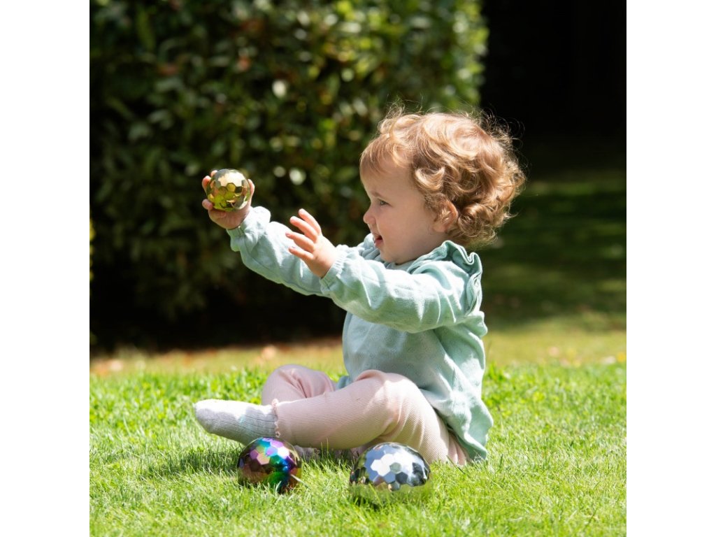 Každý míček obsahuje odlišnou náplň, která vytváří různé zvukové a pohybové efekty. Nerovný, fazetovaný povrch způsobuje nepředvídatelné kutálení, čímž podporuje aktivní objevování a přirozenou zvědavost dítěte.