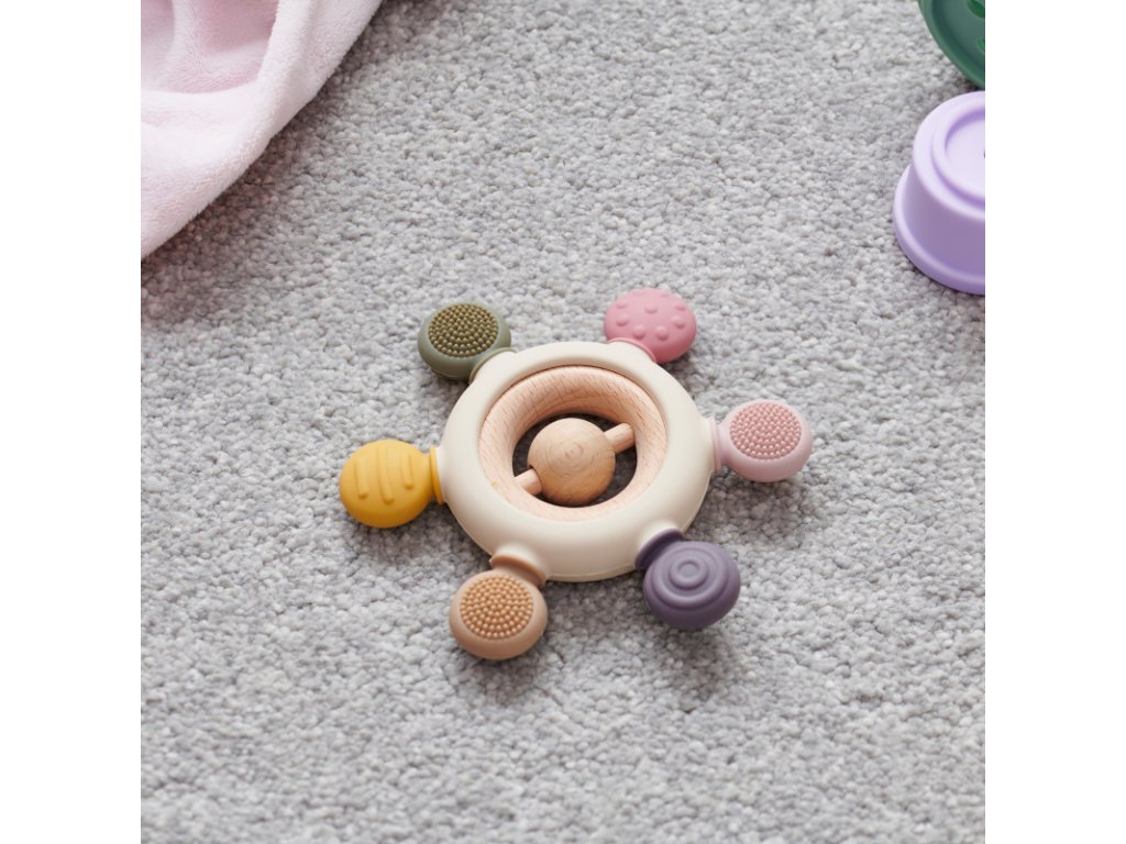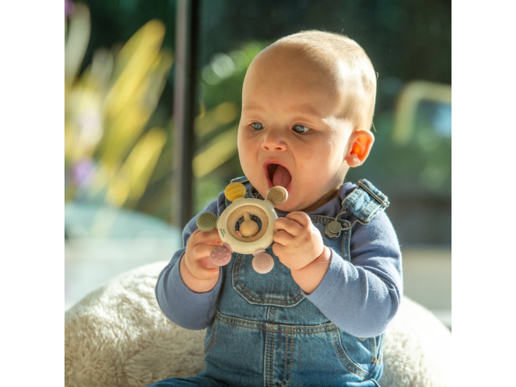 Různé textury a barvy stimulují hmat a zrak, zatímco dřevěné chrastítko uprostřed nabízí jemný zvuk jako uklidňující auditivní podnět. Skvělé jako zábavná a uklidňující pomůcka při prořezávání zoubků.