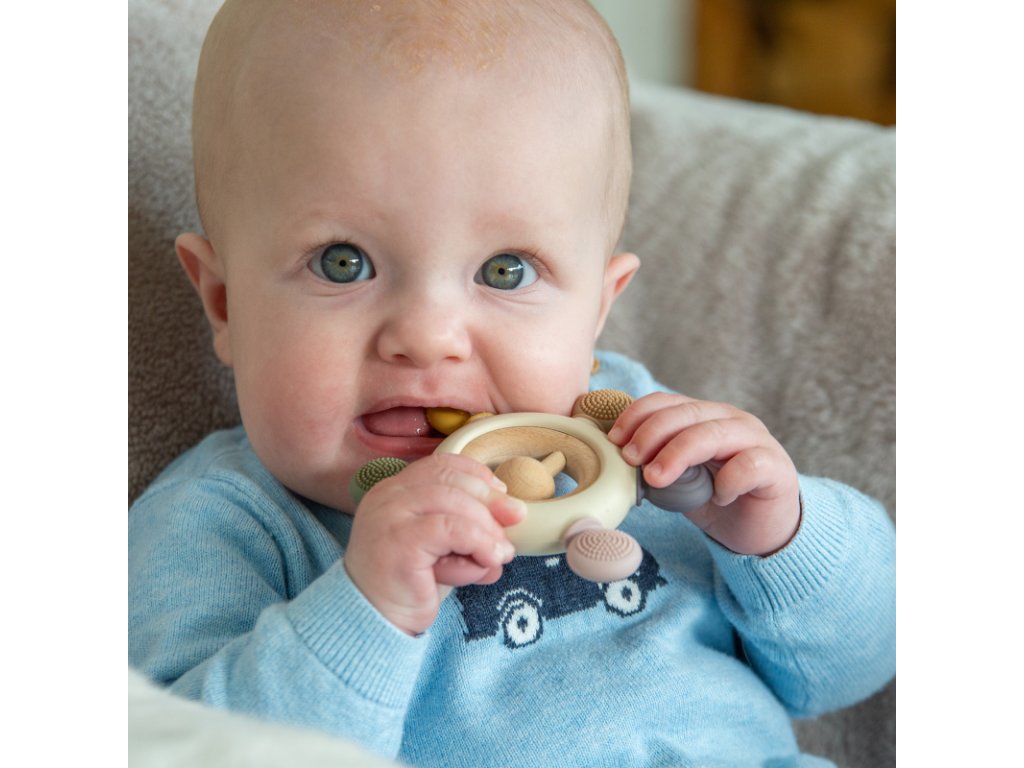 Středové dřevěné chrastítko je odnímatelné, takže silikonovou část lze snadno umýt nebo vydezinfikovat.