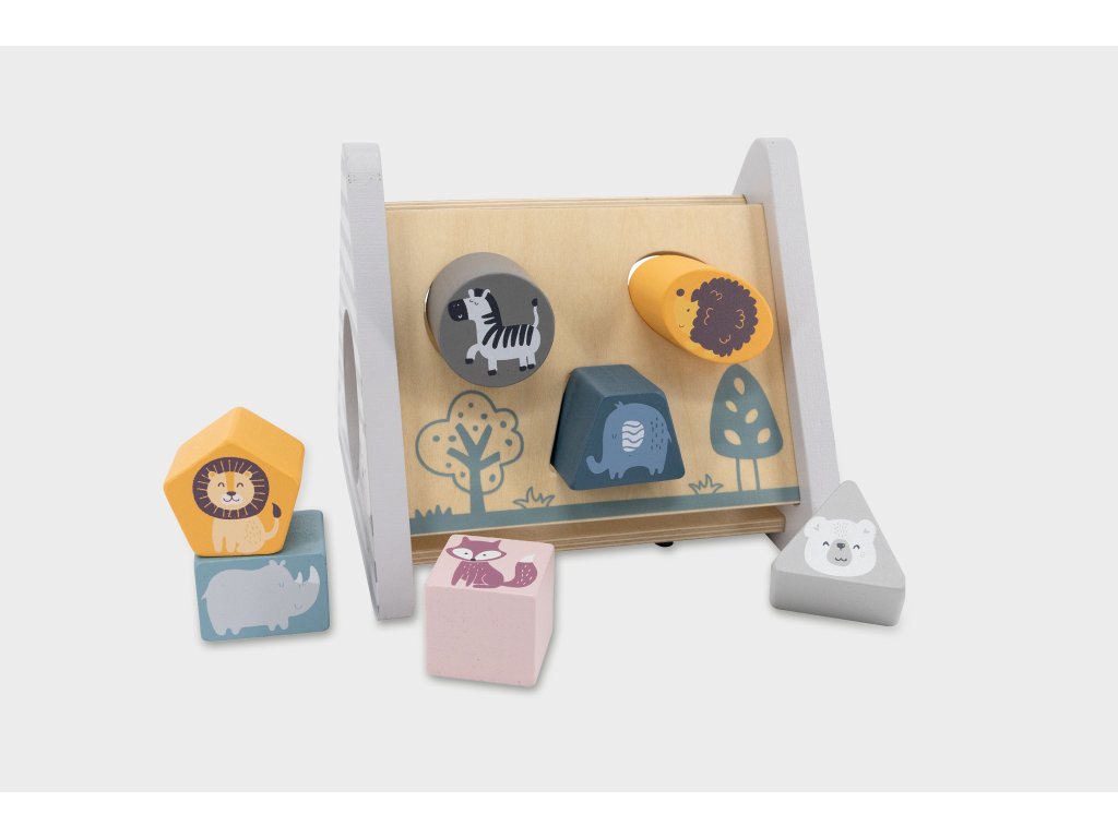 Děti mají za úkol navlékat barevné kroužky na dřevěný kolík a na závěr umístit hlavu zvířátka. Pyramida má zaoblenou základnu, která se při hře jemně houpá. Pomáhá dětem učit se barvy, rozlišovat velikosti a trénovat koordinaci ruka-oko.