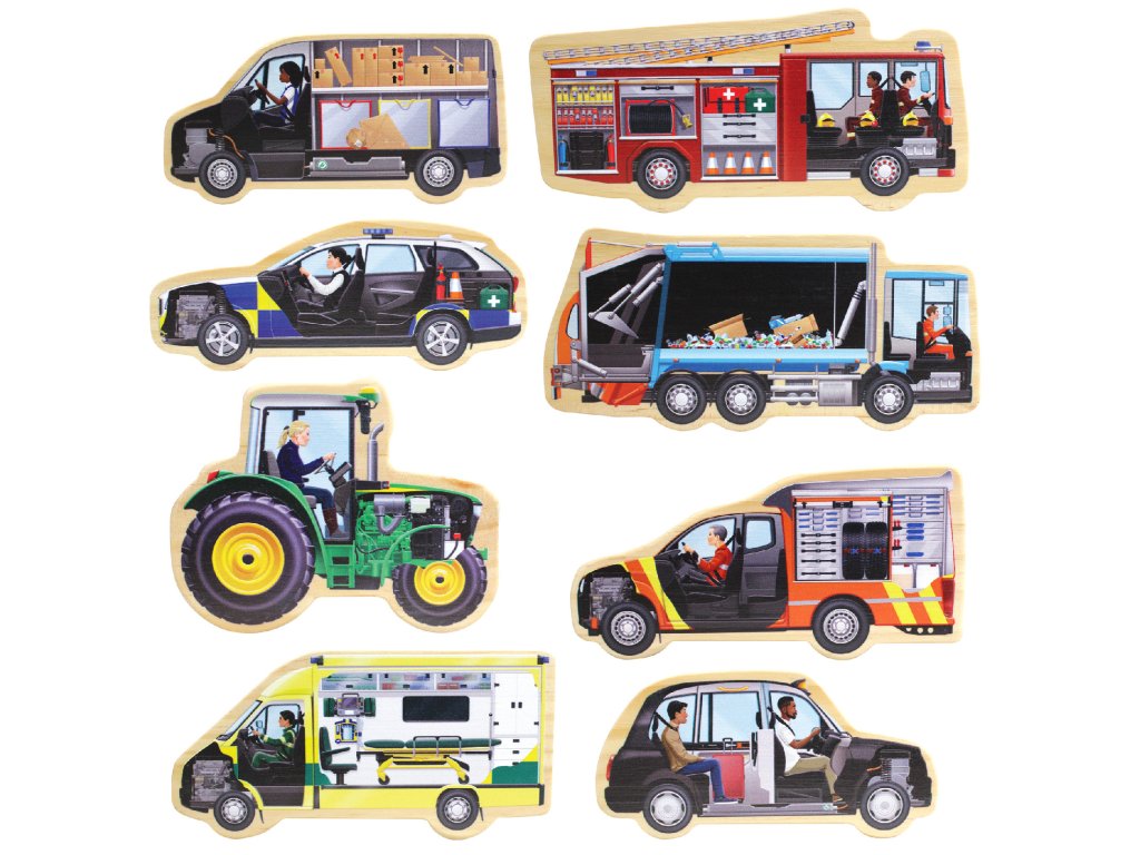 Každý kus představuje exteriér a interiér vozidla s množstvím detailů, které je třeba prozkoumat. Tyto designové prvky zvou děti, aby se pozorně podívaly, a podněcují diskusi o funkci vozidla. Vylepšete toto zkoumání pomocí lupy, která dětem umožní ponořit se do detailnějších bodů každého dílu. Plochá základna každého vozidla jim umožňuje stát vzpřímeně, čímž poskytuje příležitosti k imaginární hře a rozvíjí schopnosti vyprávění.