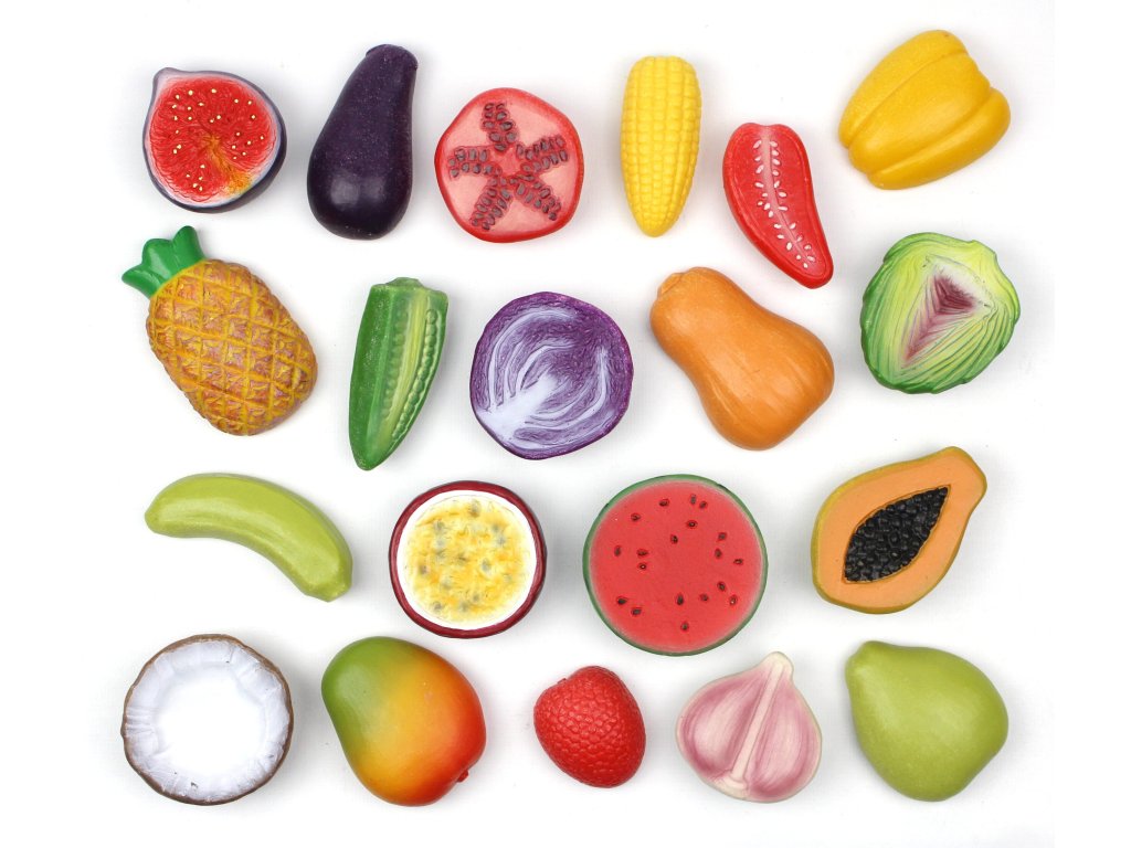 Sada obsahuje osm unikátních hmatových kamenů s motivy: zázvor, citronová tráva, česnek, lilek, červená chilli paprička, batát (sladká brambora), avokádo a hvězdicové ovoce (karambola). Každý kámen je realisticky zpracován tak, aby děti mohly zkoumat tvary a textury méně běžných druhů ovoce a zeleniny.