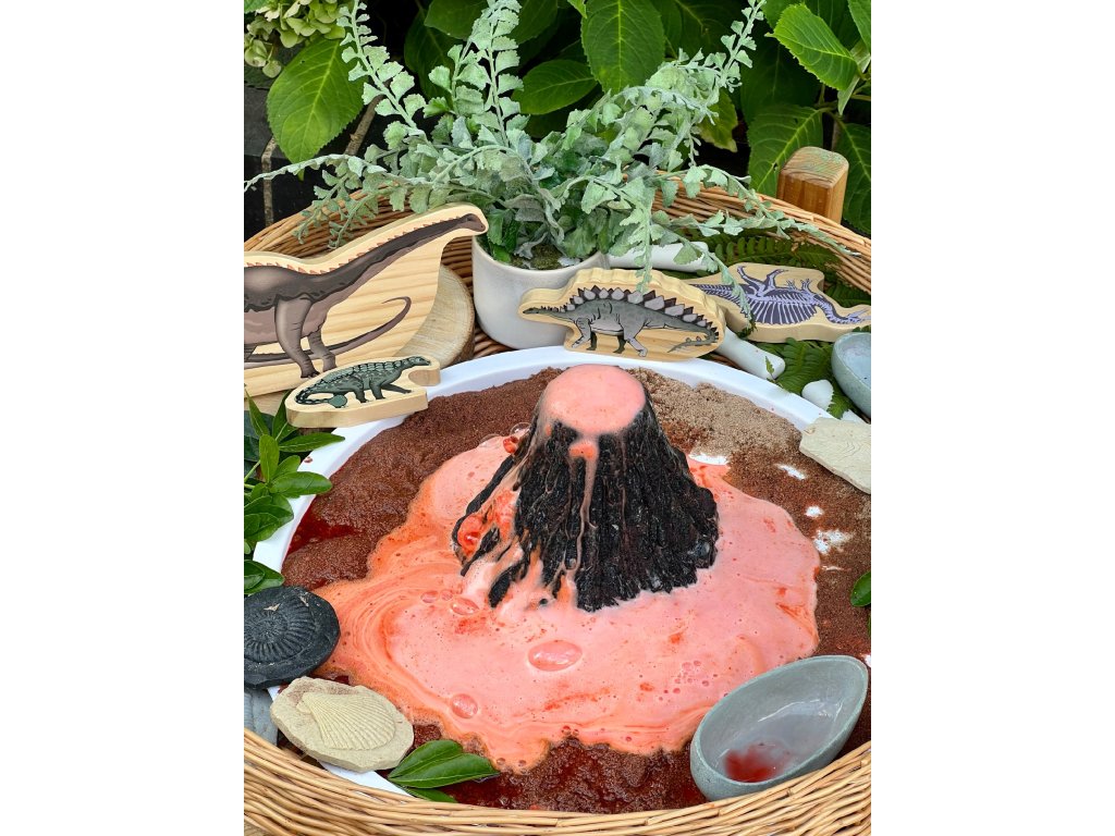 Tato dramatická rekvizita sopky je ústředním bodem pro dobrodružné hry s dinosaury nebo hrdiny. Děti mohou sopku nechat „vybuchnout“ pomocí písku nebo modelíny, nebo ji zakomponovat do blátivé kuchyně. Sopka má hmatovou strukturu lávových proudů a skály, což vybízí k smyslovému zkoumání.