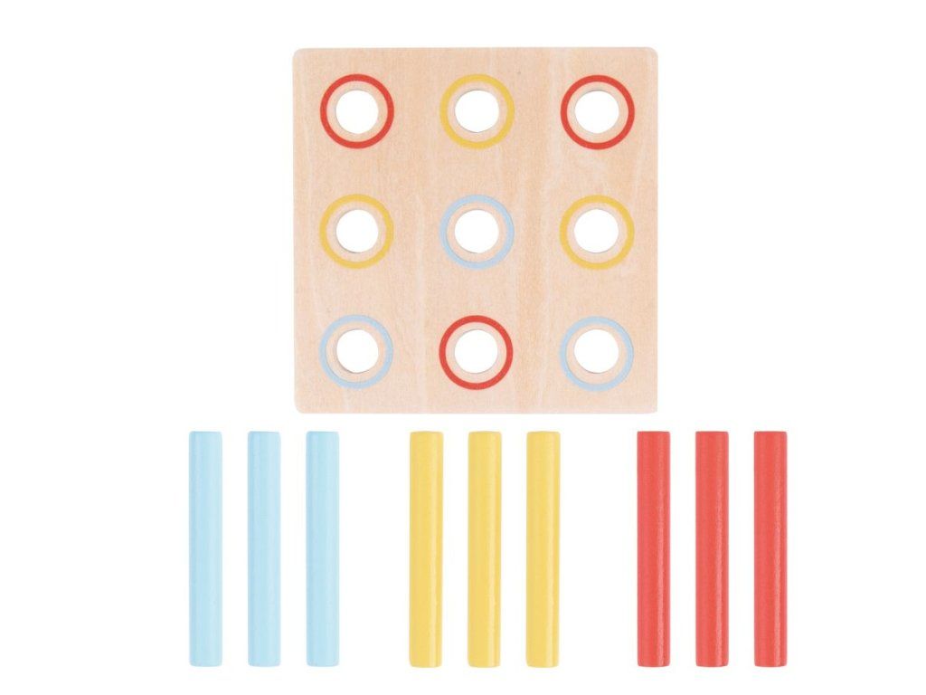 4) vhazování barevných hůlek – vhodné pro děti od 24 měsíců – nejdříve se dítě učí trefit hůlku do jakékoli z dírek. Později můžete hru udělat náročnější a dítě se musí trefit do díry ve stejné barvě jako je hůlka