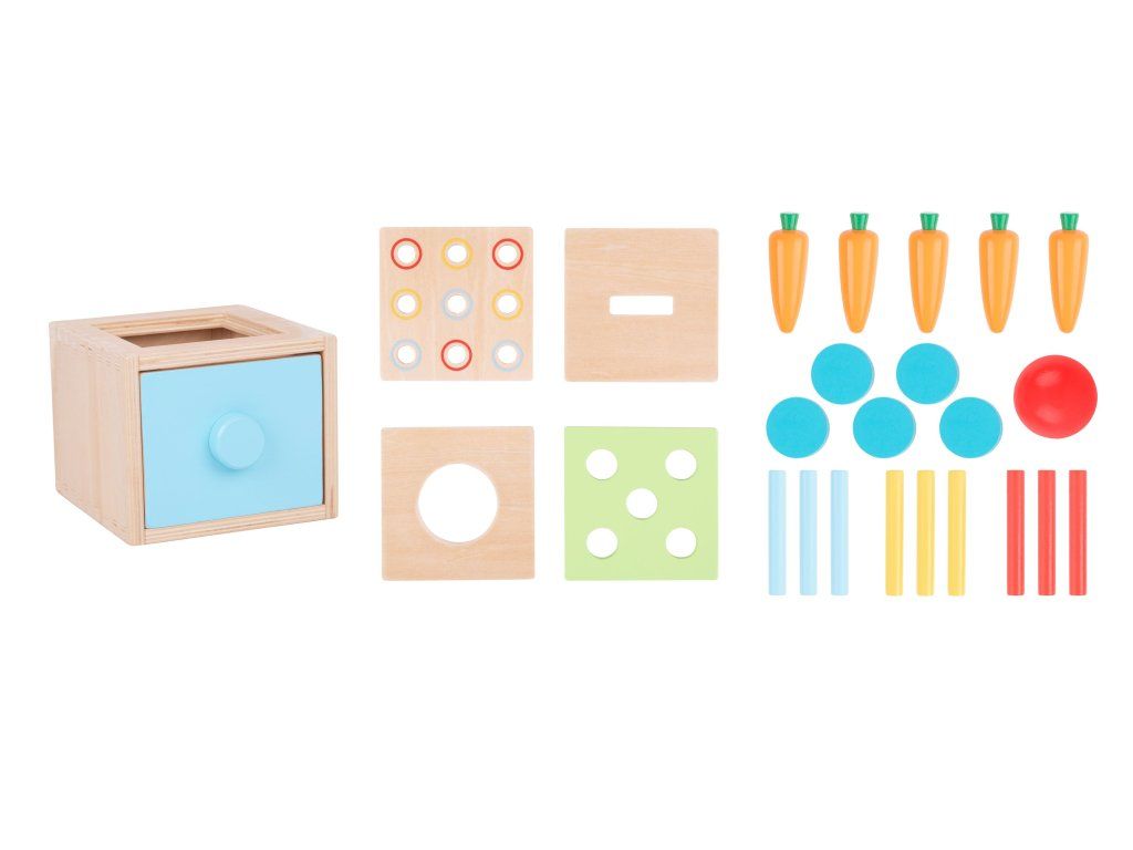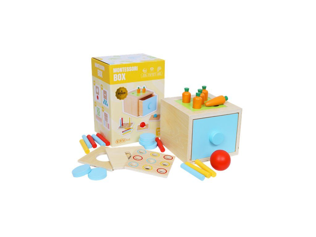 Montessori hračky jsou známé svým přístupem k podpoře přirozeného rozvoje dítěte prostřednictvím učení hrou. Montessori box je originální multifunkční hračka, která nabízí čtyři různé způsoby využití podle aktuálního rozvojového stadia děťátka. Dřevěný box se zásuvkou má vyměnitelný vrch, což umožňuje dětem měnit aktuální hru. Jaké typy vkládaček v montessori boxe najdete?